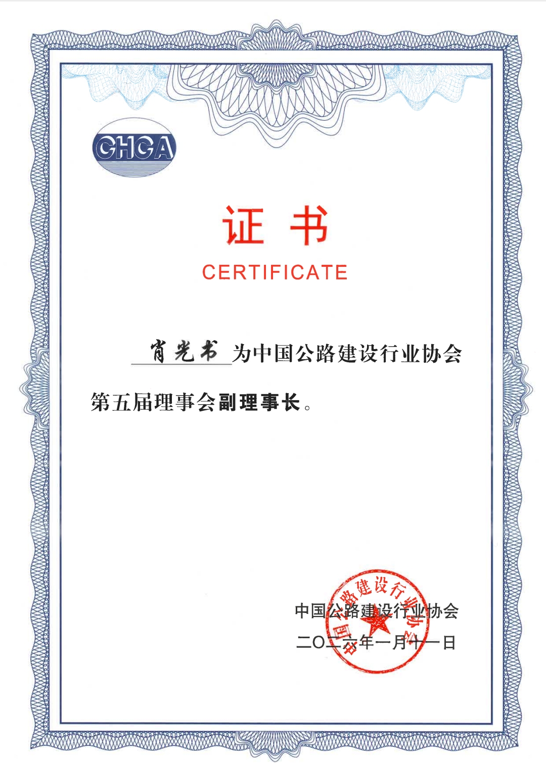 集團(tuán)公司總經(jīng)理肖光書當(dāng)選中國(guó)公路建設(shè)行業(yè)協(xié)會(huì)副理事長(zhǎng)