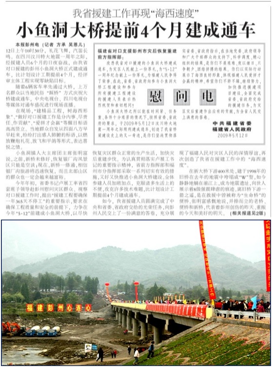 在四川汶川特大地震一周年之際,由我司對口援建的彭州小魚洞大橋正式建成通車,比計劃設計工期提前4個月,創(chuàng)造了福建在援建工作中的“海西速度”。經(jīng)評審主體工程實現(xiàn)零缺陷目標,向彭州人民交上了一份滿意的答卷。